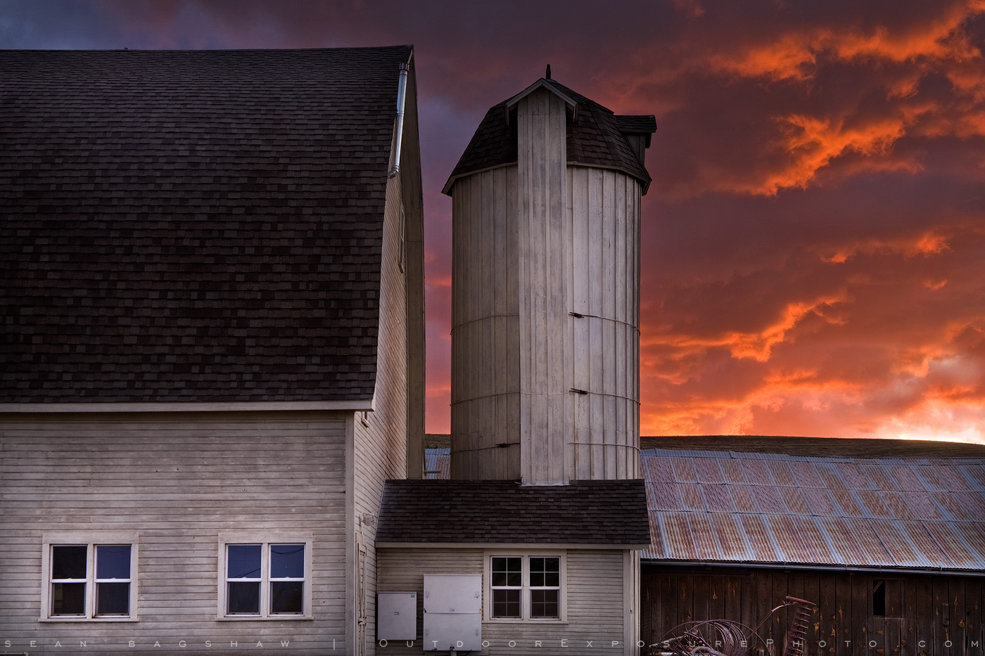 The Palouse region of Washington State offers rolling farmland, wide-open skies and interesting agriculture structures and equipment – all delights for the photographer’s eye. I took advantage of an oncoming storm of thunder and lightning to catch a brilliant backdrop for this typical barn and silo.