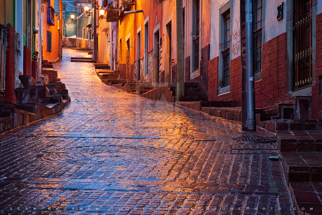 Taken before dawn in a light rain in Guanajuato, Mexico. The water slicked cobbles brilliantly reflected the streetlights and sky.