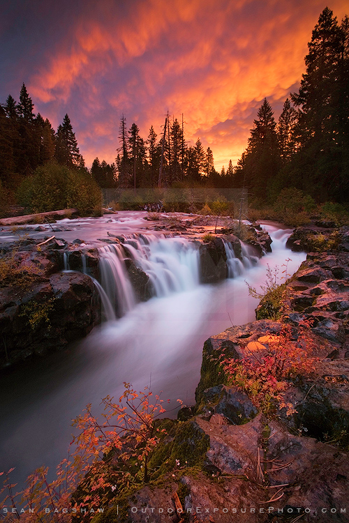 It pays to be out early on a fall morning when you can catch a sunrise like this. The intense light burns bright colors in the clouds, rocks and foliage as the Rogue River cascades into the Rogue River Gorge on its way to the Rogue Valley in southern Oregon.