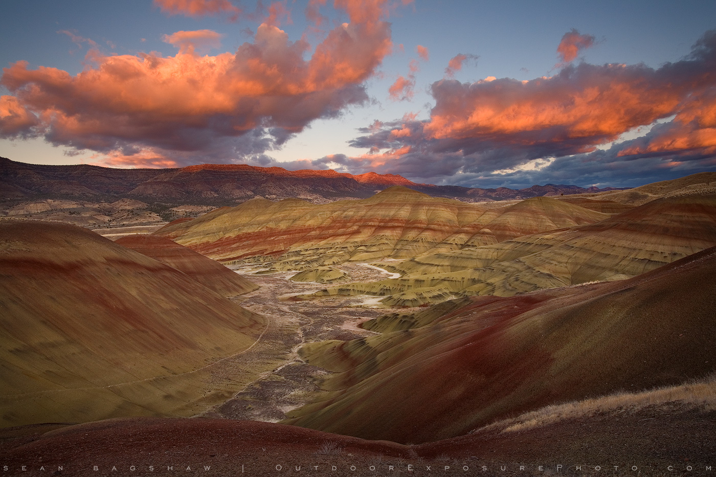 The aptly named Painted Hills show off a variety of colors beneath a warm summer sunset. The Painted Hills are located in the John Day Fossil Beds National Monument in central Oregon. Once an ancient river flood plain the area, rich with fossil remains, is an important site for paleontologists.