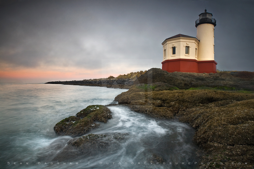 The Coquille River Lighthouse with its simple architectural lines stands watch on a cloudy day in Bullard’s Beach State Park, Bandon, Oregon. Technical navigation equipment made the lighthouse obsolete in the 1940s and it was abandoned for many years. Now restored, it is lit by a solar powered light which recreates its former grandeur for the viewing delight of its many visitors.