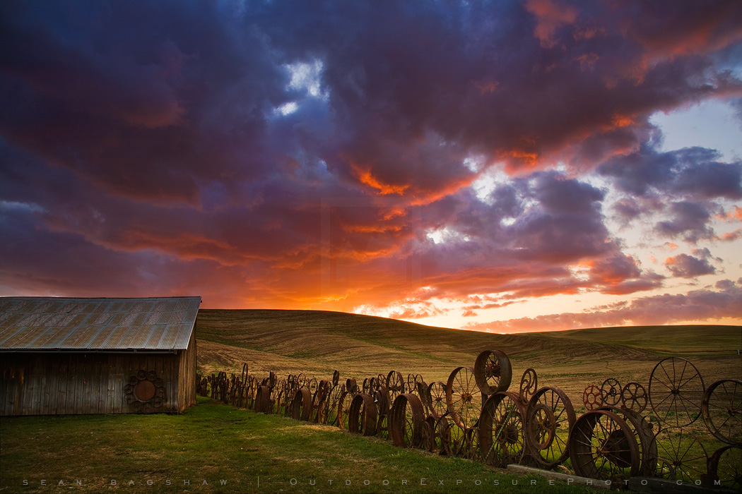 Artful tractor wheel fence at sunset on a Palouse ranch, Washington State.