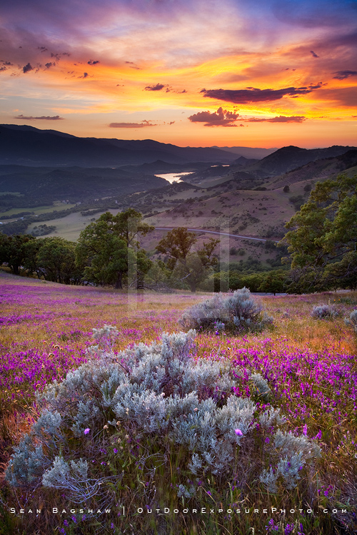 Sage and vetch in a meadow in the hills above Ashland, Oregon under a brilliant orange sunset sky.