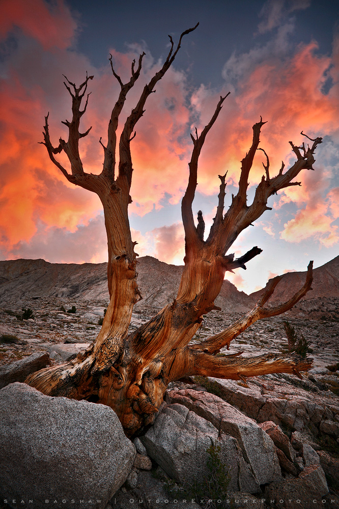 The ancient remains of a jeffery pine that once grew out of solid granite is illuminated by a fiery sunset in the high Sierra.