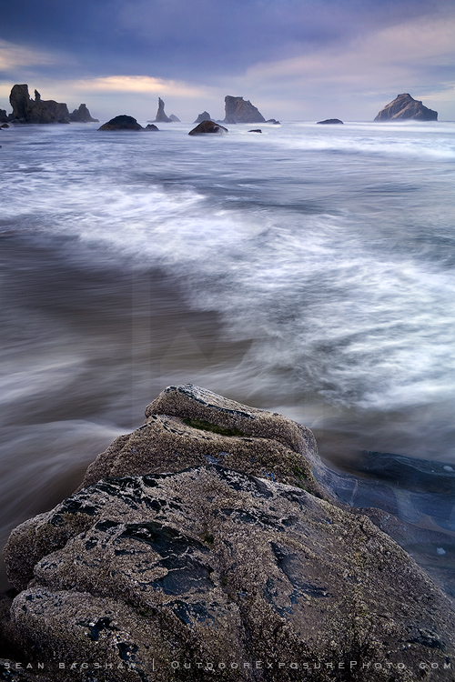 The beach at Bandon, Oregon offers visitors an array of sea stack formations standing majestically just off shore. Face Rock in the upper right corner is a favorite. The barnacle covered rock in the foreground sparkles in the low light; a slow shutter speed causes the blurred wave motion.