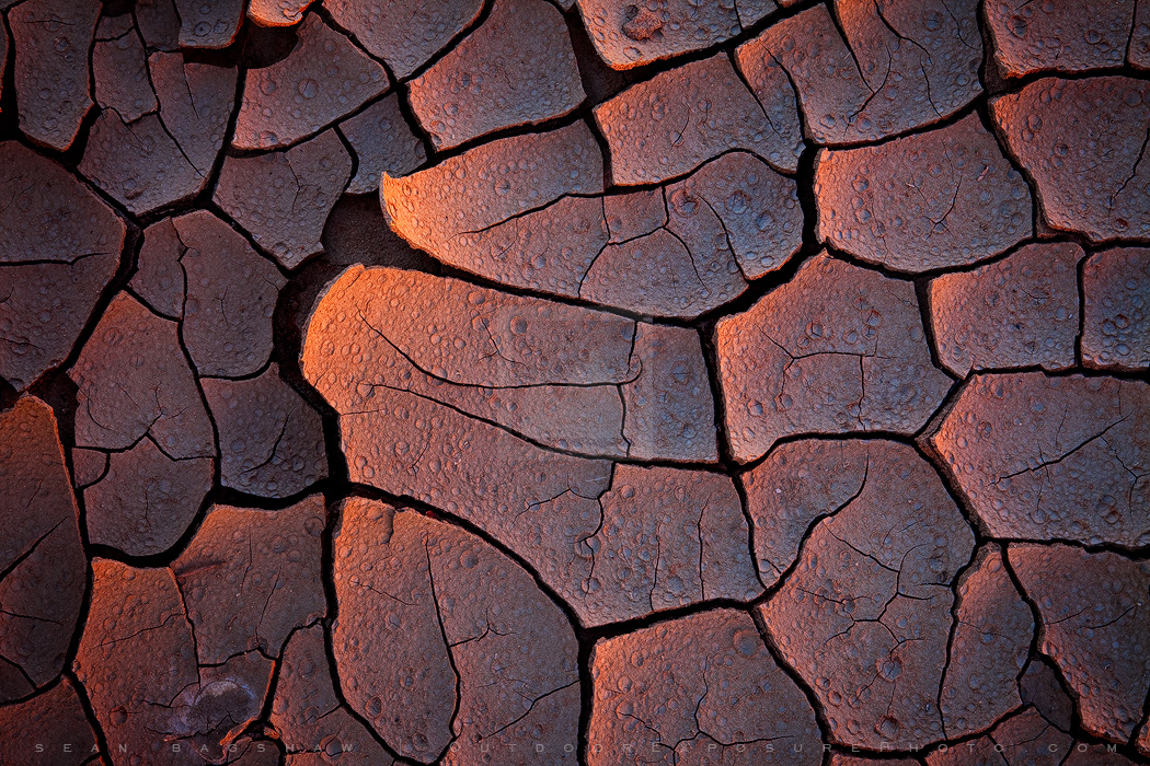 Cracked and peeling mud in the Utah desert, pitted by rain and glowing with light reflected off the bank of the dry riverbed. This scene was too harsh in full direct sunlight, so I shaded the area with my jacket allowing the indirect light from the riverbank and sky to show through.