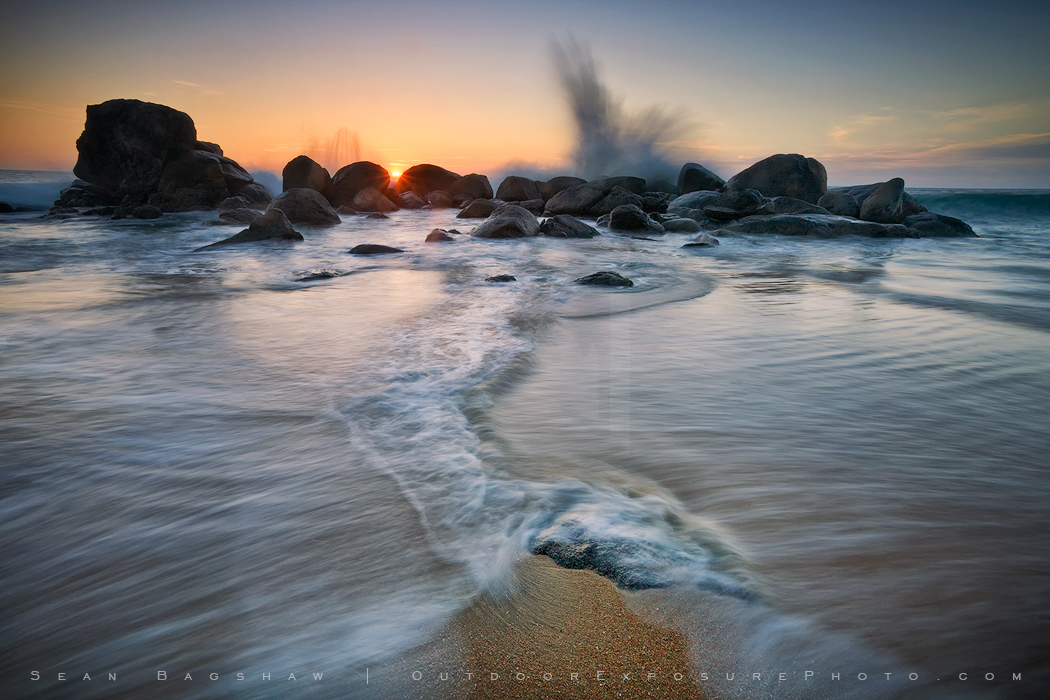 As the sun sets, waves from the Pacific Ocean crash and swirl around a formation of rocks along the coast of Mexico near Sayulita.